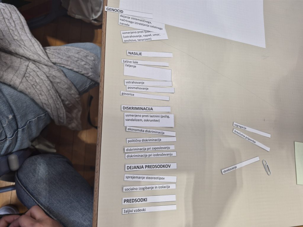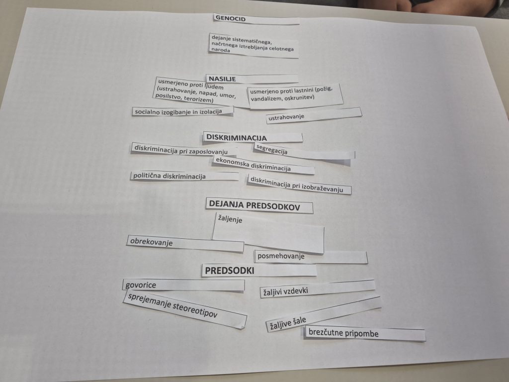 Za uvod so osmošolci spoznali piramido nestrpnosti in sovraštva, ki prikazuje, kako se lahko na videz majhne oblike nespoštovanja stopnjujejo v resne in nevarne oblike nasilja. Razprava jih je spodbudila k razmišljanju, kako pomembno je prepoznati nestrpnost že v njenih najzgodnejših oblikah.