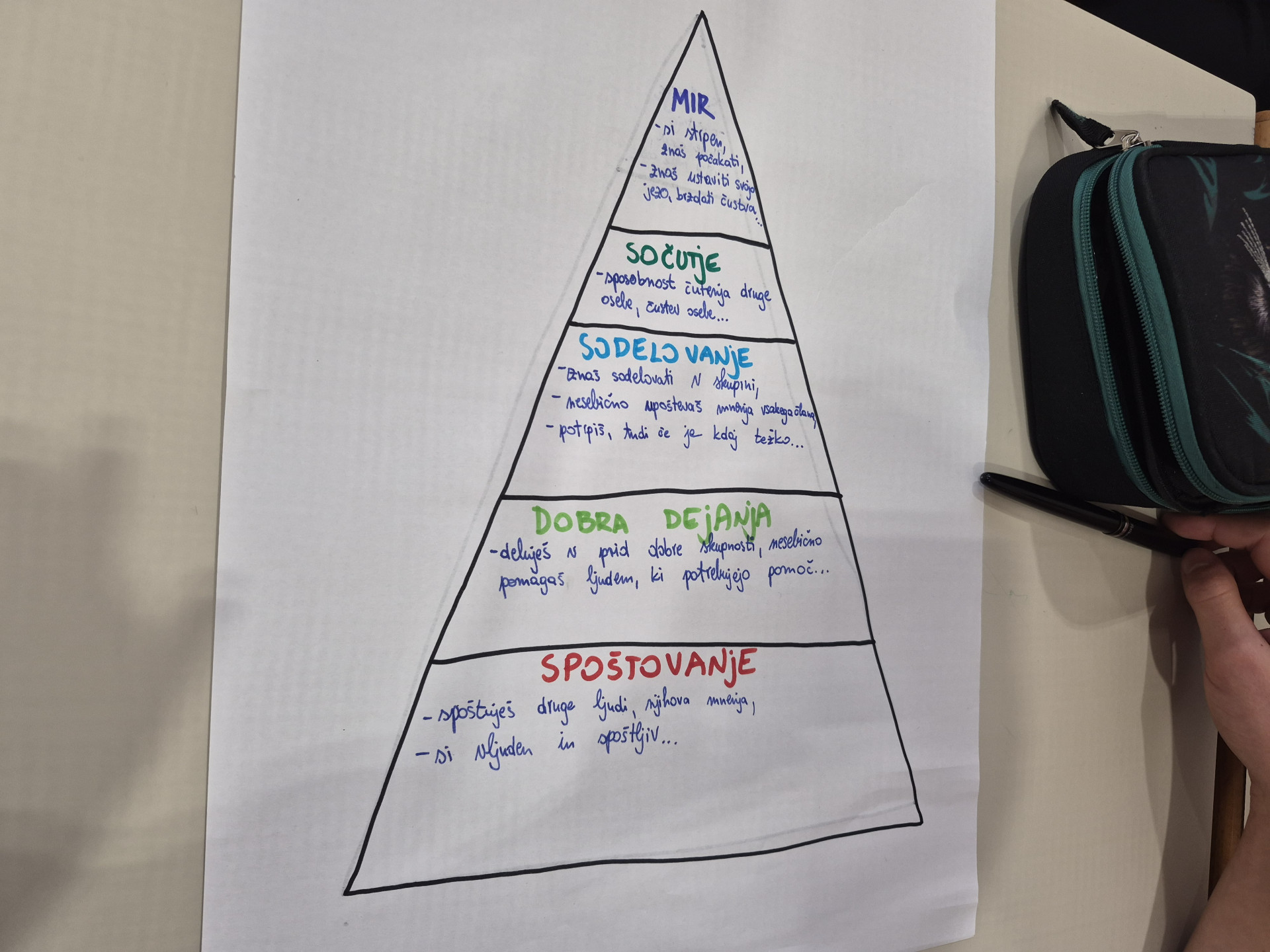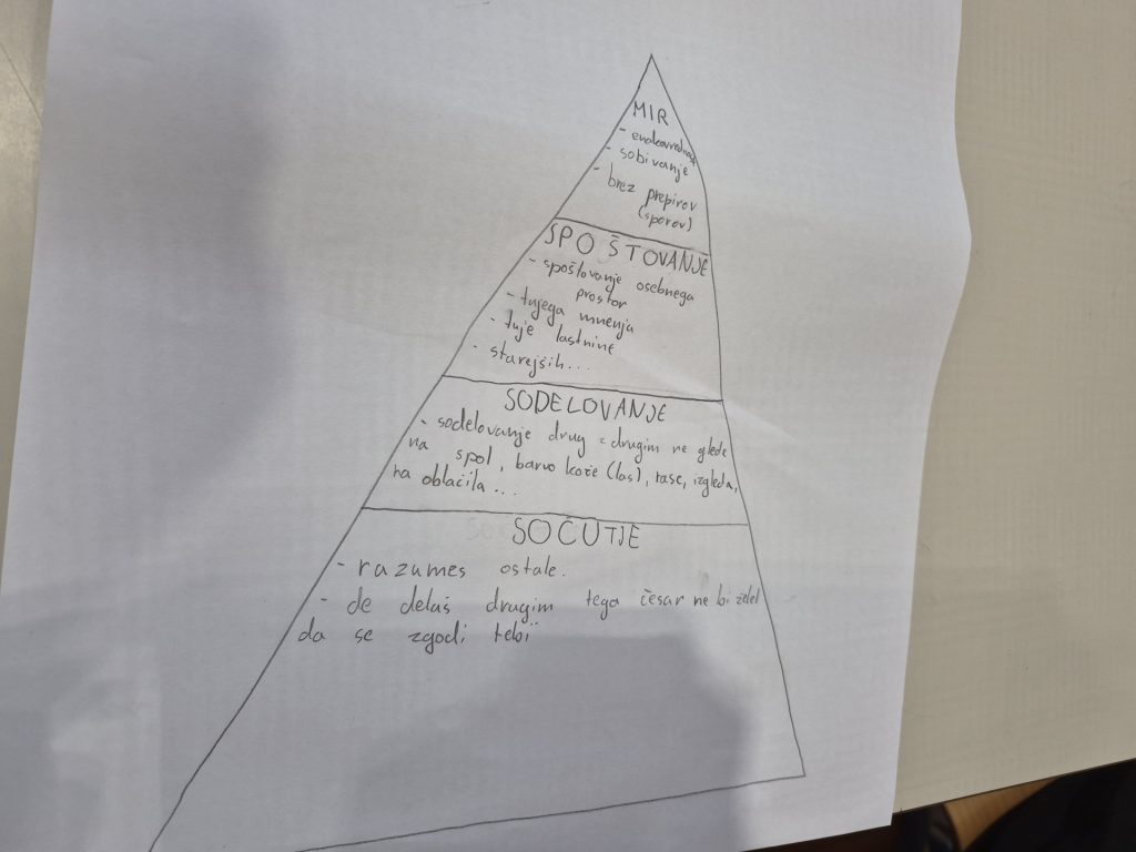V nadaljevanju so učenci odigrali slike z ljudmi, s katerimi ne bi želeli biti, ter tako razmišljali o mejah, osebnem prostoru in spoštovanju raznolikosti. Ustvarili so tudi svojo piramido miru, v katero so zapisali, kaj lahko sami prispevajo k bolj strpnemu in varnemu okolju.