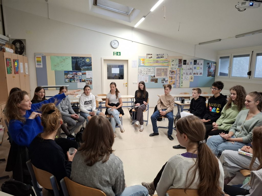 Izredno prijazna, srčna in topla oseba je slovenska pisateljica Špela Frlic, avtorica mladinskega romana Bleščivka (2022), ki je v letu 2022 prejel nagrado večernica za najboljše mladinsko delo. Toliko, da je kljub že opravljenem obisku 11. oktobra prostovoljno in z velikim veseljem ponovno prišla med nas tudi ob zgodnji uri, za kar smo ji iskreno hvaležni.