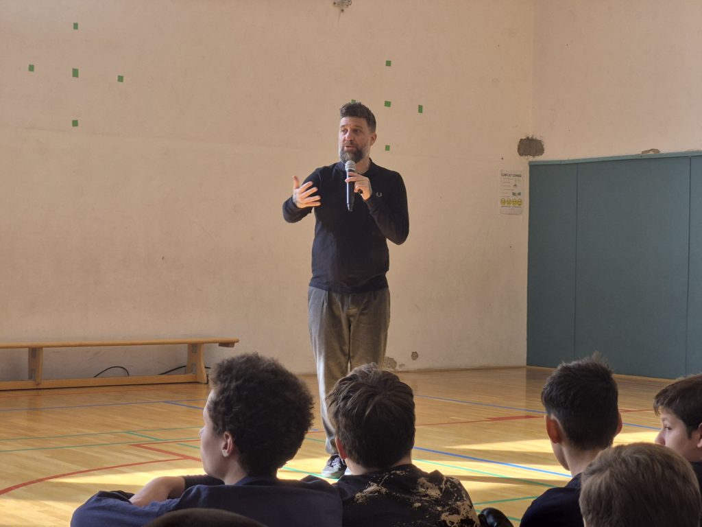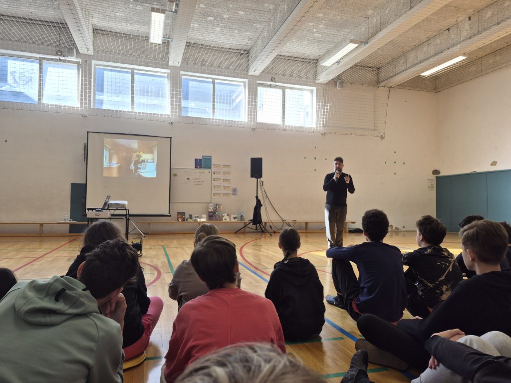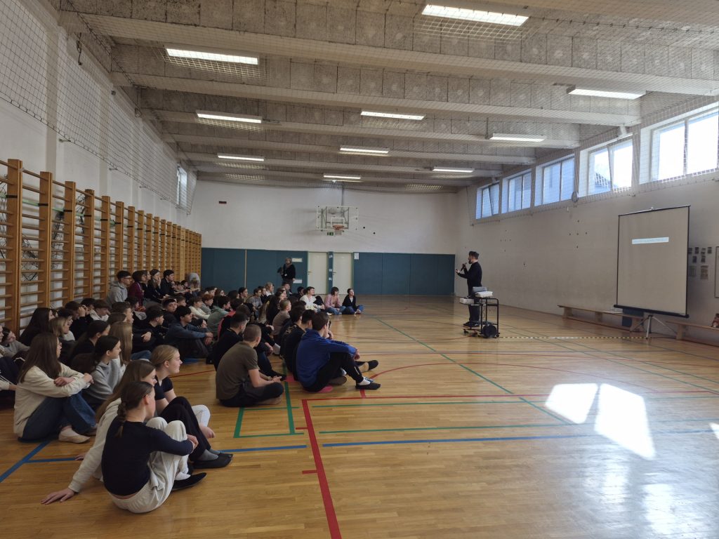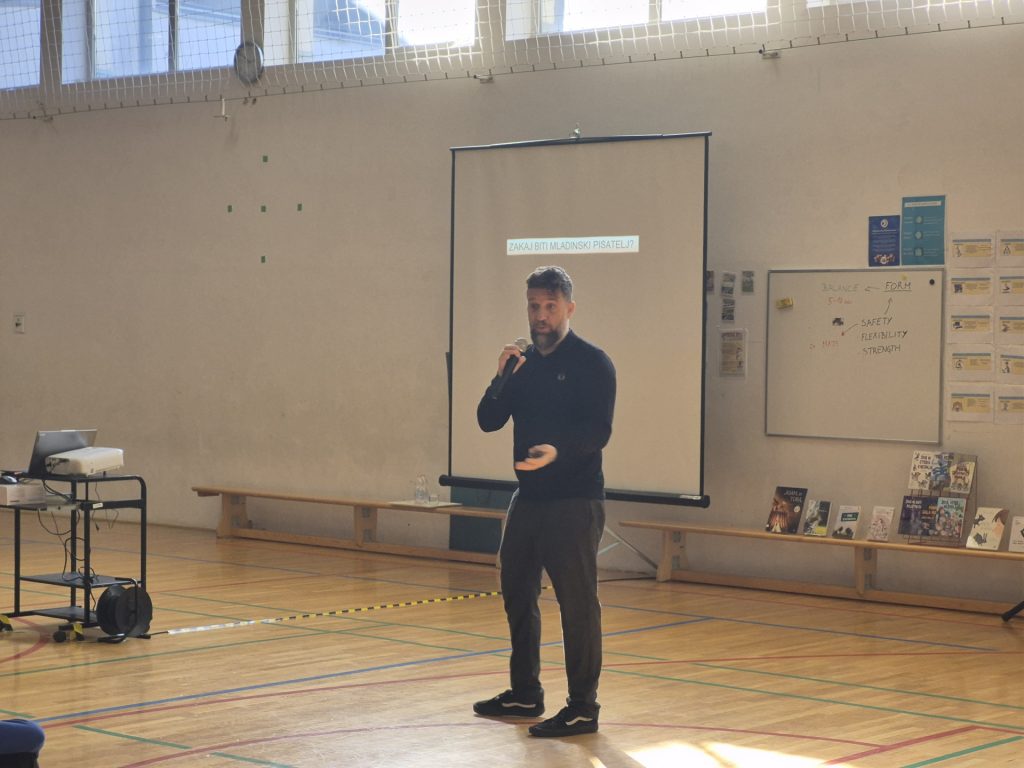 V petek, 6. marca 2026, je na našo šolo prišel prav poseben gost – pisatelj Žiga X. Gombač. Učencem 8. razreda je v eni šolski uri pokazal, da pisateljevanje ne pomeni le tiho sedeti za mizo in pisati, ampak zahteva tudi veliko domišljije, humorja in ustvarjalnih idej za zanimive zgodbe.
