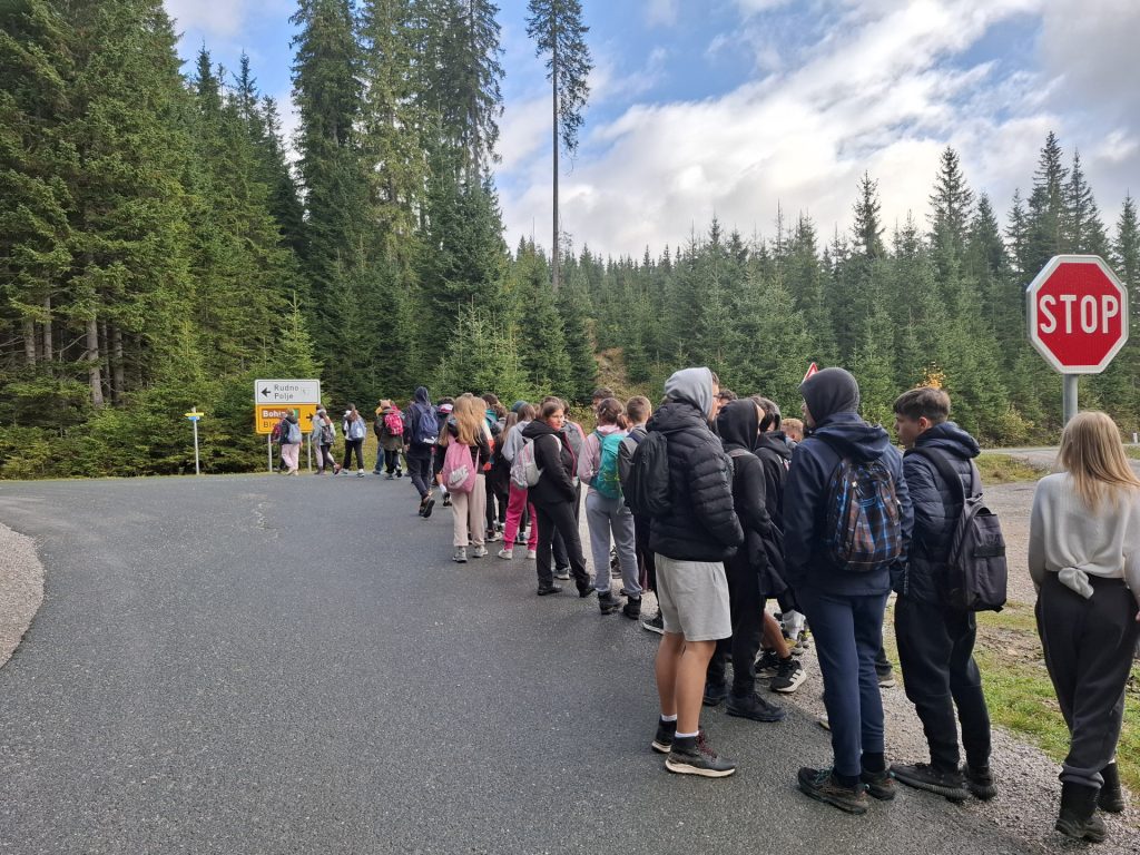 Po zajtrku so se učenci 8. b in c kot prava ekipa odpravili proti planini Zajavornik. Sonce se je sramežljivo prebilo skozi oblake, smrekovi gozdovi so dišali kot oglas za naravne osvežilce zraka, jutranja rosa pa je opozarjala: pripravi bundo, zima že kuka za vogalom.
